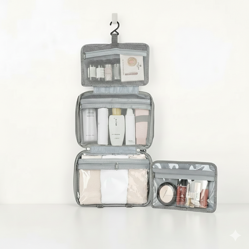 Grâce à son crochet intégré, la trousse peut être dépliée et accrochée facilement dans une salle de bain, un hôtel, un camping ou même dans un espace réduit.